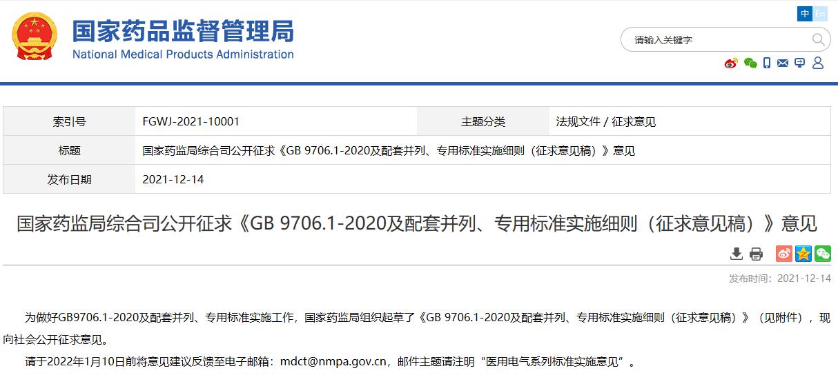 國家藥監(jiān)局綜合司公開征求《GB 9706.1-2020及配套并列、專用標準實施細則(征求意見稿)》意見