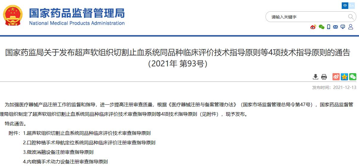 國家藥監(jiān)局關(guān)于發(fā)布超聲軟組織切割止血系統(tǒng)同品種臨床評價技術(shù)指導原則等4項技術(shù)指導原則的通告(2021年 第93號)