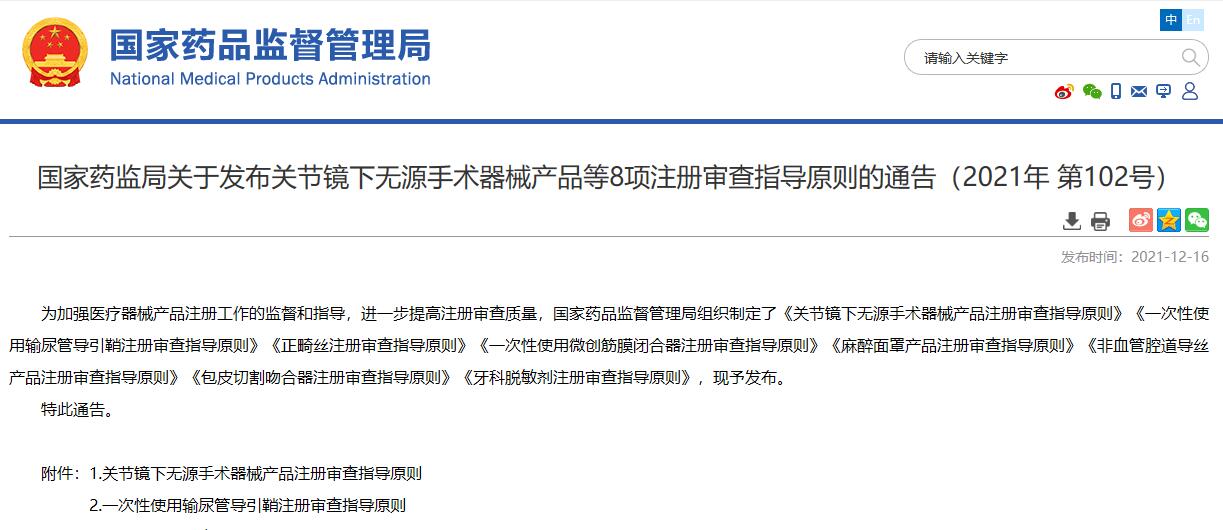 國家藥監(jiān)局關(guān)于發(fā)布關(guān)節(jié)鏡下無源手術(shù)器械產(chǎn)品等8項注冊審查指導原則的通告(2021年 第102號)