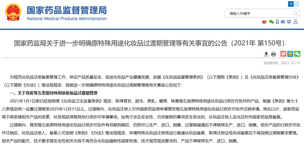 國家藥監(jiān)局關(guān)于進一步明確原特殊用途化妝品過渡期管理等有關(guān)事宜的公告(2021年 第150號)