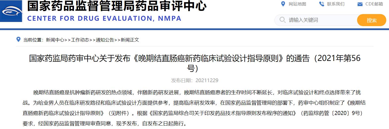 國家藥監局藥審中心關于發布《晚期結直腸癌新藥臨床試驗設計指導原則》的通告(2021年第56號)
