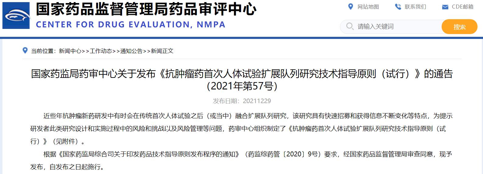 國家藥監局藥審中心關于發布《抗腫瘤藥首次人體試驗擴展隊列研究技術指導原則(試行)》的通告(2021年第57號)