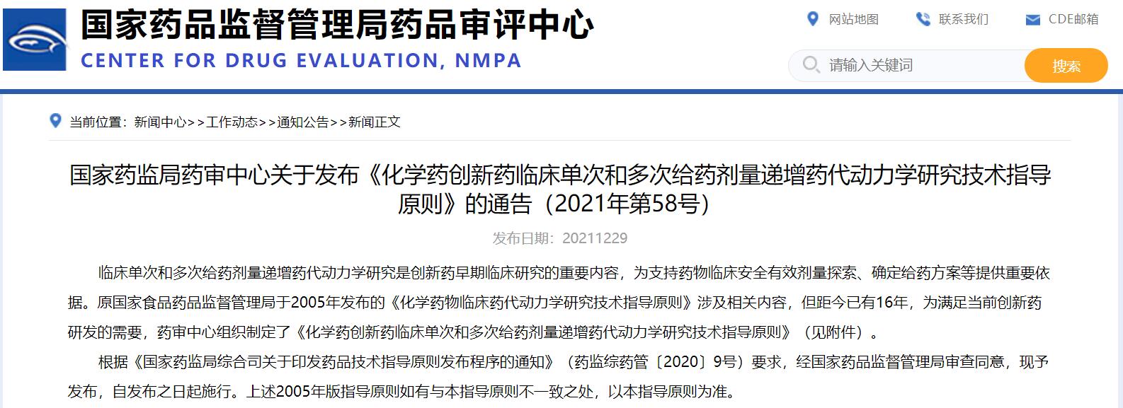 國家藥監局藥審中心關于發布《化學藥創新藥臨床單次和多次給藥劑量遞增藥代動力學研究技術指導原則》的通告(2021年第58號)