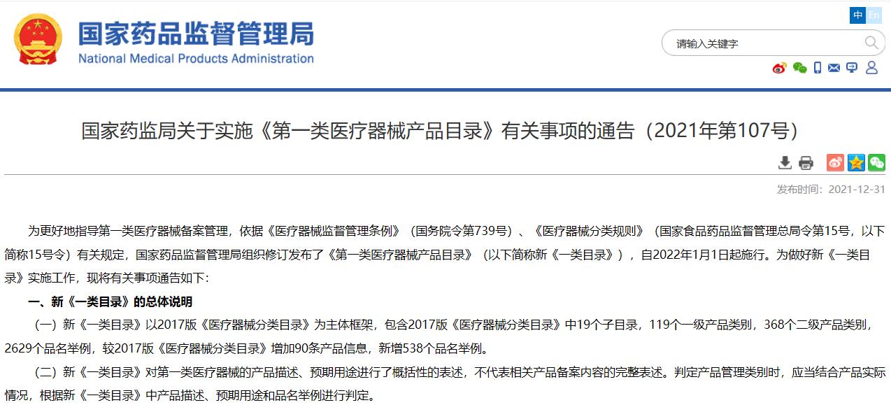 國家藥監局關于實施《第一類醫療器械產品目錄》有關事項的通告(2021年第107號)