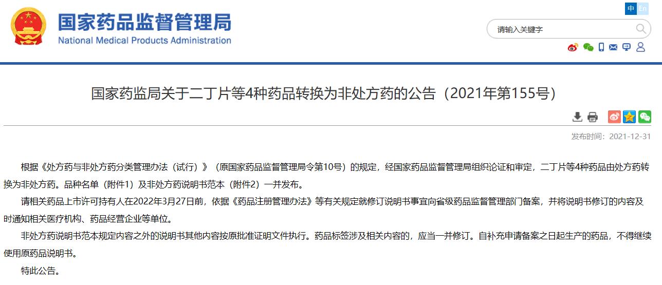 國家藥監局關于二丁片等4種藥品轉換為非處方藥的公告(2021年第155號)