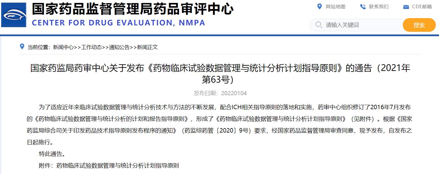 國家藥監局藥審中心關于發布《藥物臨床試驗數據管理與統計分析計劃指導原則》的通告(2021年第63號)