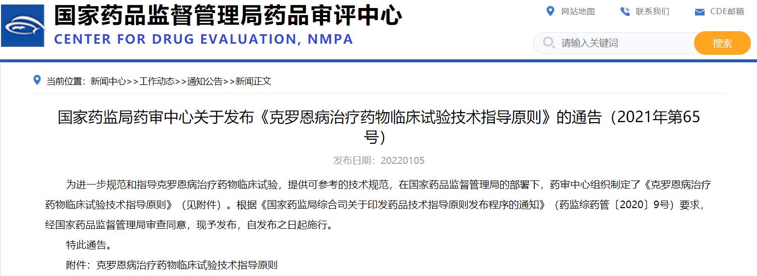 國家藥監局藥審中心關于發布《克羅恩病治療藥物臨床試驗技術指導原則》的通告(2021年第65號)