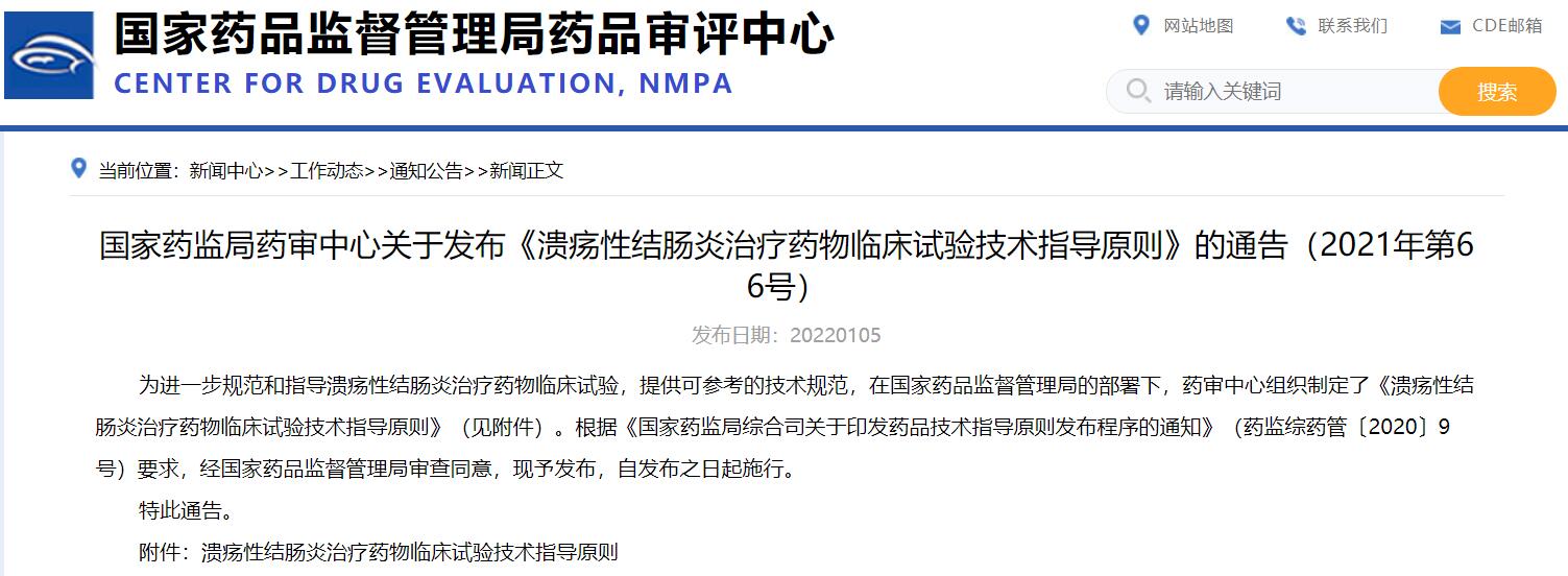 國家藥監局藥審中心關于發布《潰瘍性結腸炎治療藥物臨床試驗技術指導原則》的通告(2021年第66號)