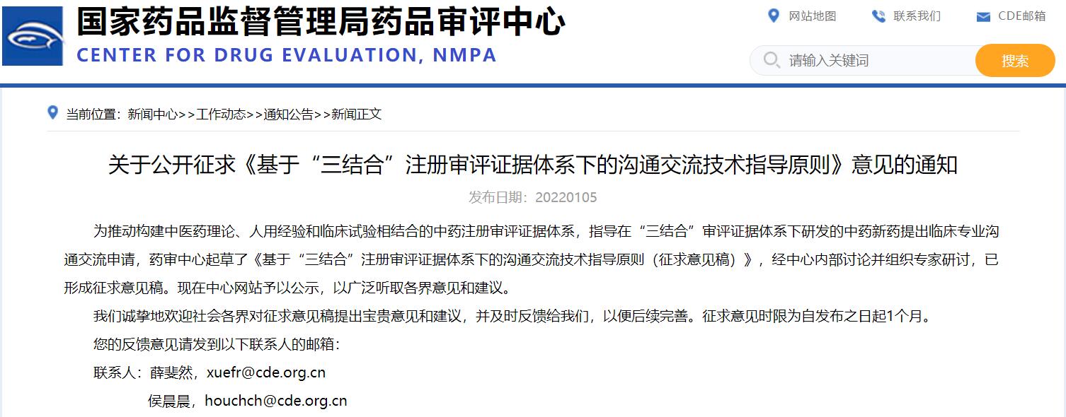 關于公開征求《基于“三結合”注冊審評證據體系下的溝通交流技術指導原則》意見的通知
