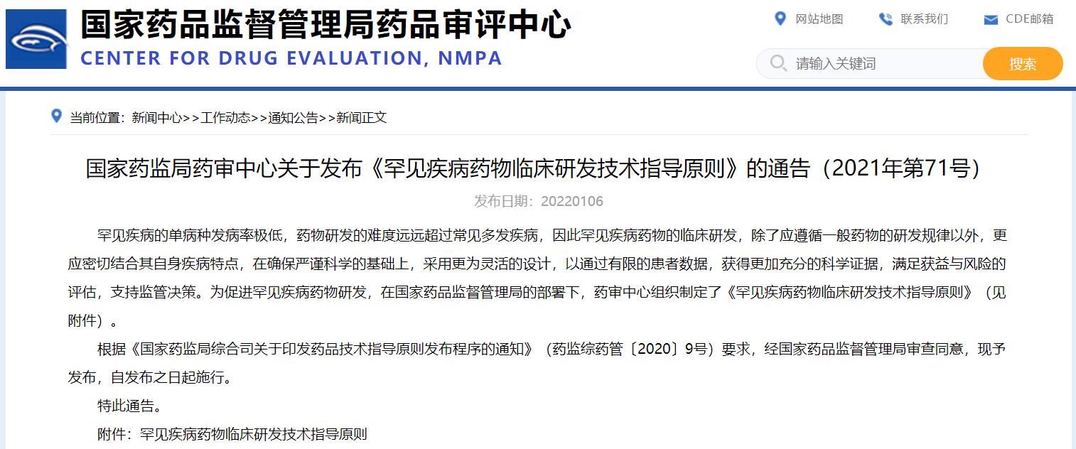 國家藥監局藥審中心關于發布《罕見疾病藥物臨床研發技術指導原則》的通告(2021年第71號)