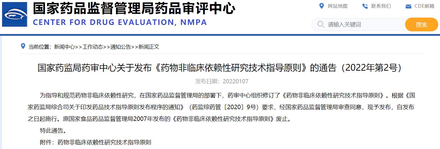 國家藥監局藥審中心關于發布《藥物非臨床依賴性研究技術指導原則》的通告(2022年第2號)