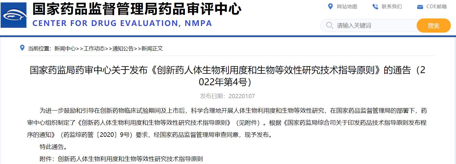 國家藥監局藥審中心關于發布《創新藥人體生物利用度和生物等效性研究技術指導原則》的通告(2022年第4號)