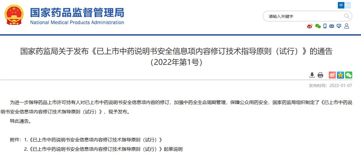 國家藥監局關于發布《已上市中藥說明書安全信息項內容修訂技術指導原則(試行)》的通告 (2022年第1號)