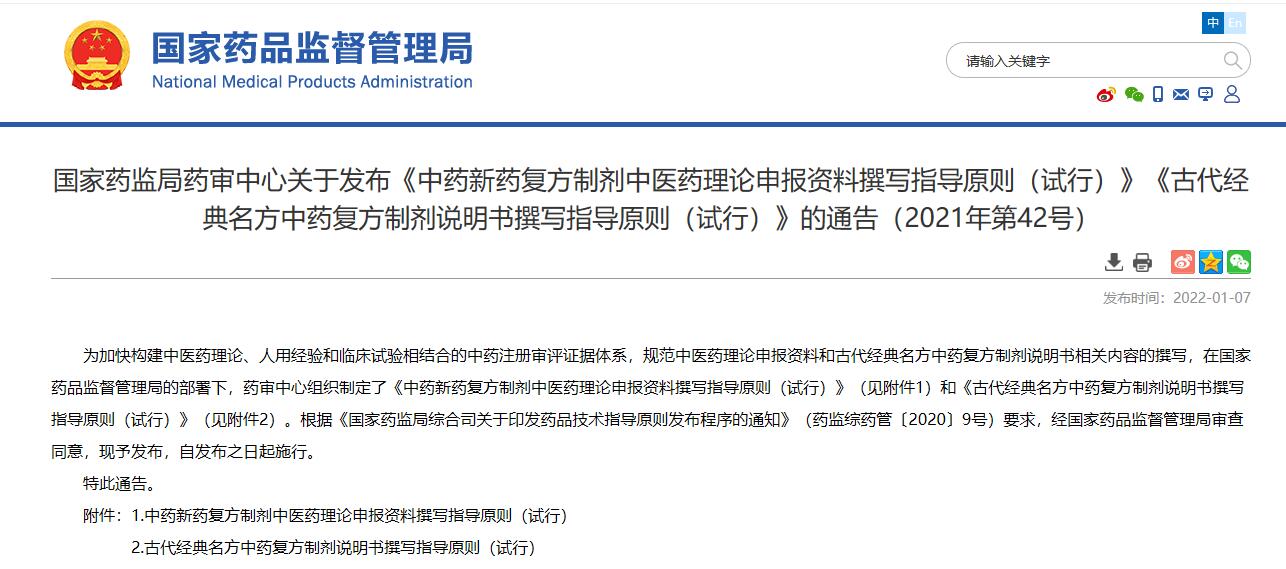國家藥監局藥審中心關于發布《中藥新藥復方制劑中醫藥理論申報資料撰寫指導原則(試行)》《古代經典名方中藥復方制劑說明書撰寫指導原則(試行)》的通告(2021年第42號)