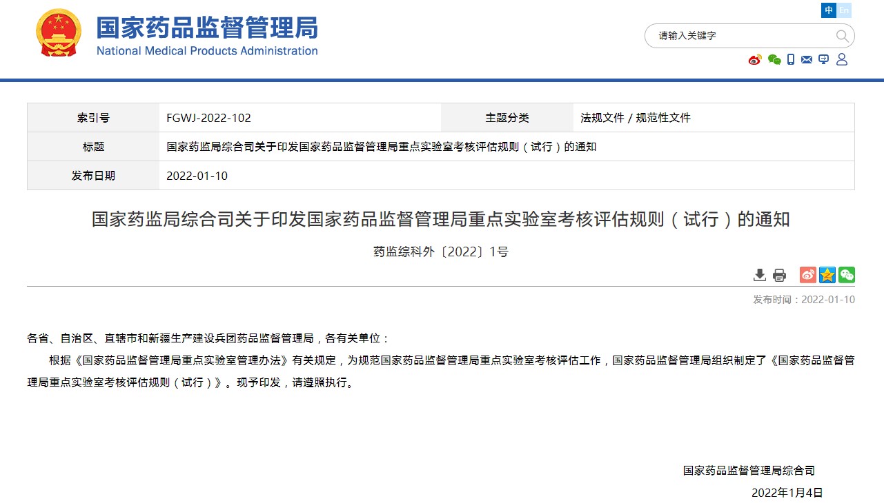 根據《國家藥品監督管理局重點實驗室管理辦法》有關規定,為規范國家藥品監督管理局重點實驗室考核評估工作,國家藥品監督管理局組織制定了《國家藥品監督管理局重點實驗室考核評估規則(試行)》