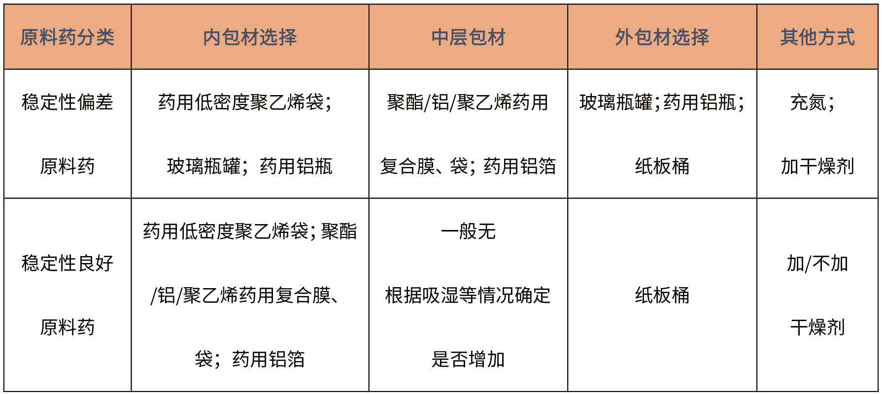 根據(jù)原料藥化學(xué)性質(zhì)穩(wěn)定性情況,包材選擇常規(guī)如下: