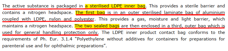 ? 包裝(第一層):活性物質(zhì)裝入滅菌LDPD袋(我們認(rèn)為是聚酯/低密度聚乙烯藥用復(fù)合膜、袋(PET/LDPE)),充氮;提供一個(gè)無(wú)菌屏障;(未明確是扎口還是封口)。