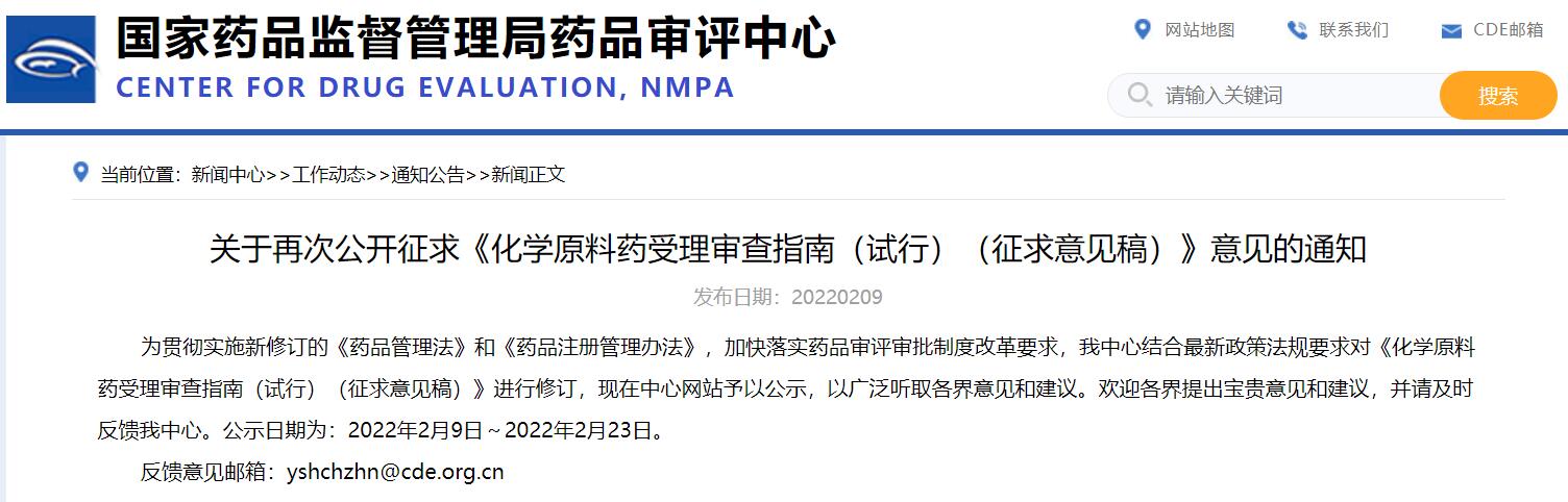 關于再次公開征求《化學原料藥受理審查指南(試行)(征求意見稿)》意見的通知