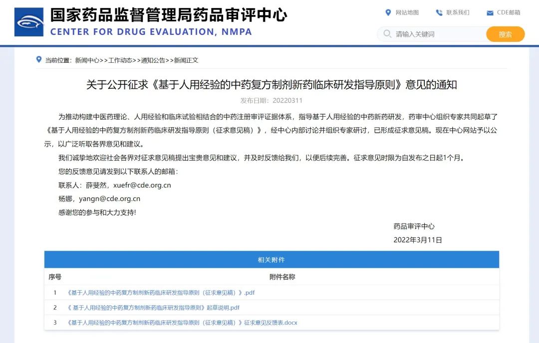 關于公開征求《基于人用經驗的中藥復方制劑新藥臨床研發指導原則》意見的通知