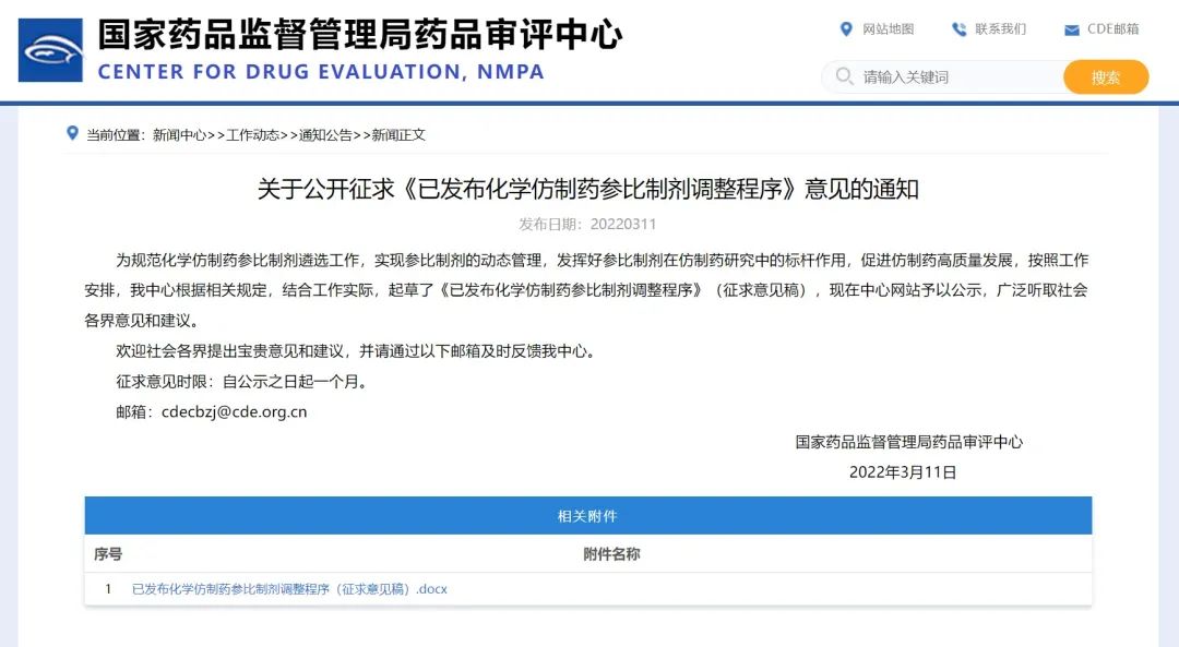 關于公開征求《已發布化學仿制藥參比制劑調整程序》意見的通知
