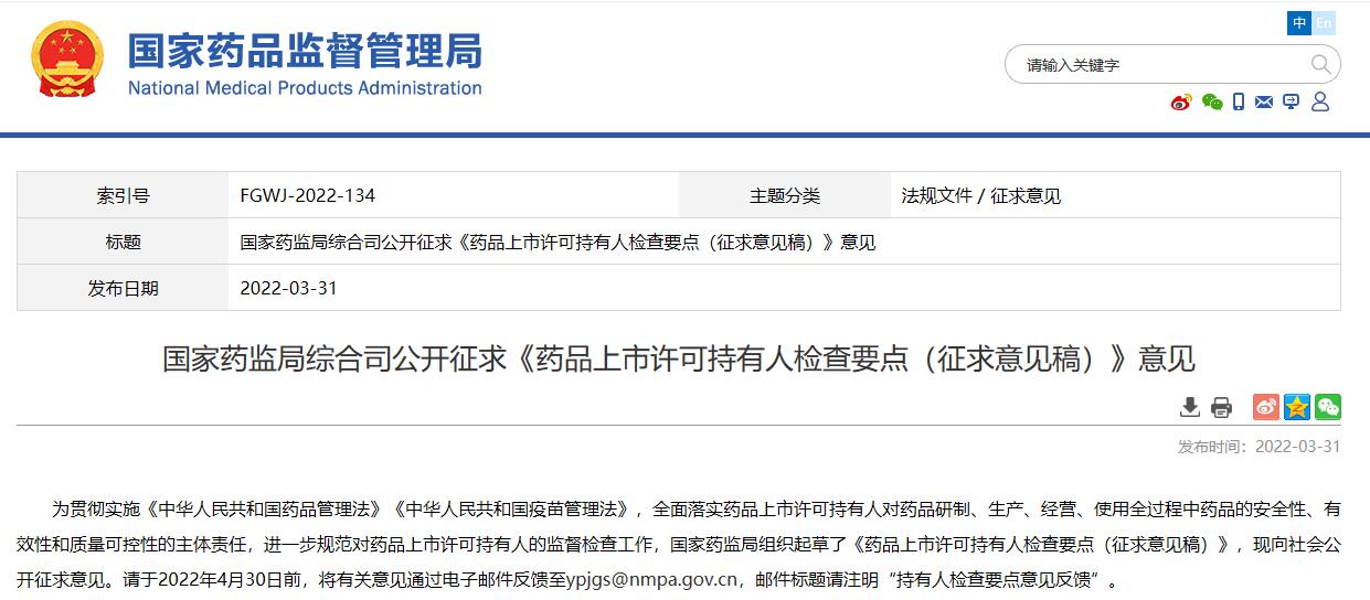 國家藥監(jiān)局綜合司公開征求《藥品上市許可持有人檢查要點(diǎn)(征求意見稿)》意見