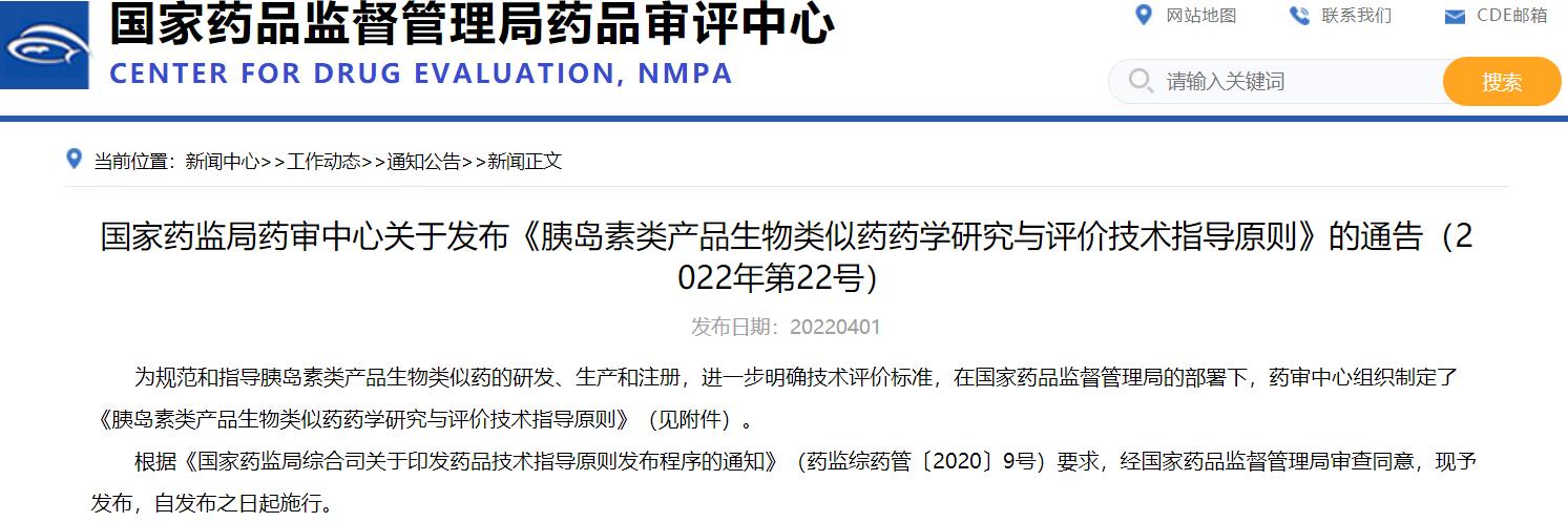 國家藥監(jiān)局藥審中心關(guān)于發(fā)布《胰島素類產(chǎn)品生物類似藥藥學(xué)研究與評(píng)價(jià)技術(shù)指導(dǎo)原則》的通告(2022年第22號(hào))