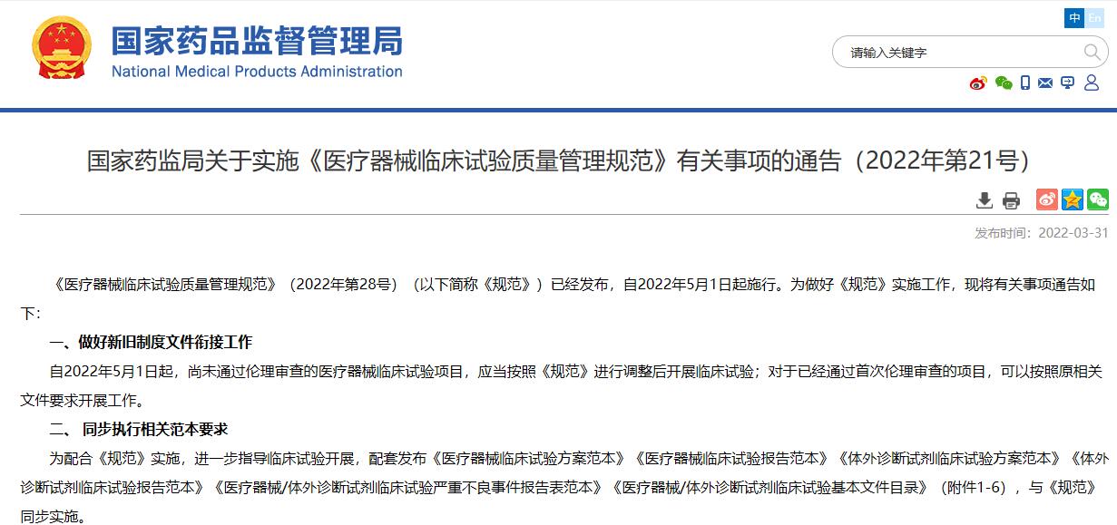 國家藥監(jiān)局關(guān)于實(shí)施《醫(yī)療器械臨床試驗(yàn)質(zhì)量管理規(guī)范》有關(guān)事項(xiàng)的通告(2022年第21號(hào))