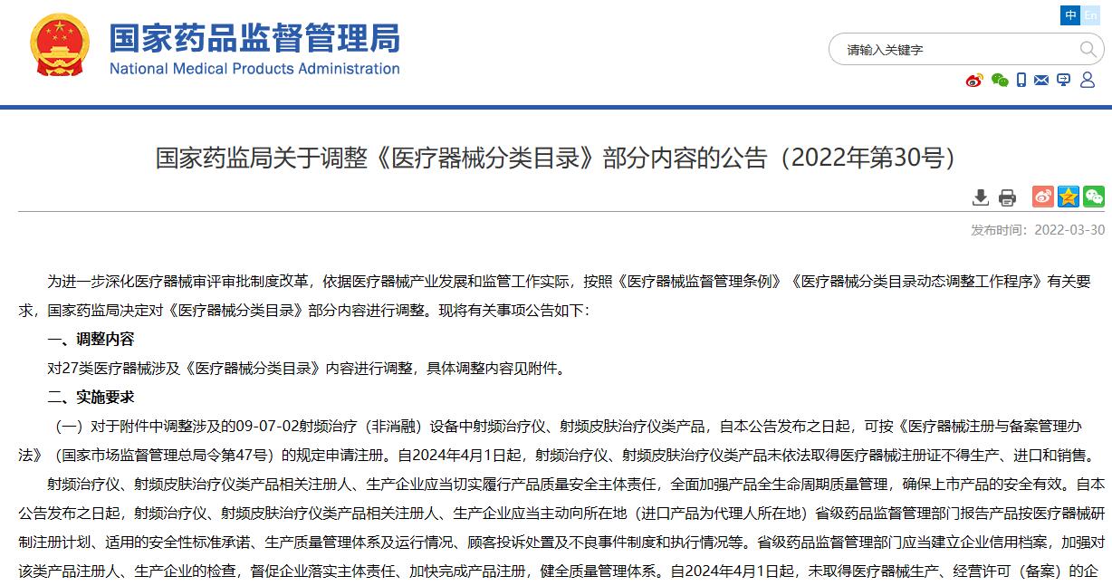 國家藥監(jiān)局關(guān)于調(diào)整《醫(yī)療器械分類目錄》部分內(nèi)容的公告(2022年第30號(hào))