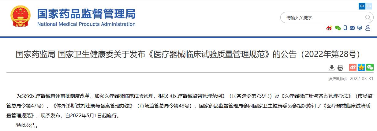 國家藥監(jiān)局 國家衛(wèi)生健康委關(guān)于發(fā)布《醫(yī)療器械臨床試驗(yàn)質(zhì)量管理規(guī)范》的公告(2022年第28號(hào))