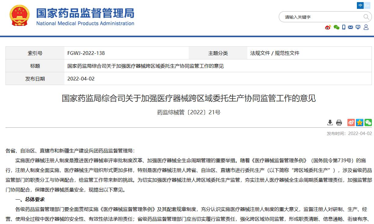 國家藥監(jiān)局綜合司關(guān)于加強(qiáng)醫(yī)療器械跨區(qū)域委托生產(chǎn)協(xié)同監(jiān)管工作的意見
