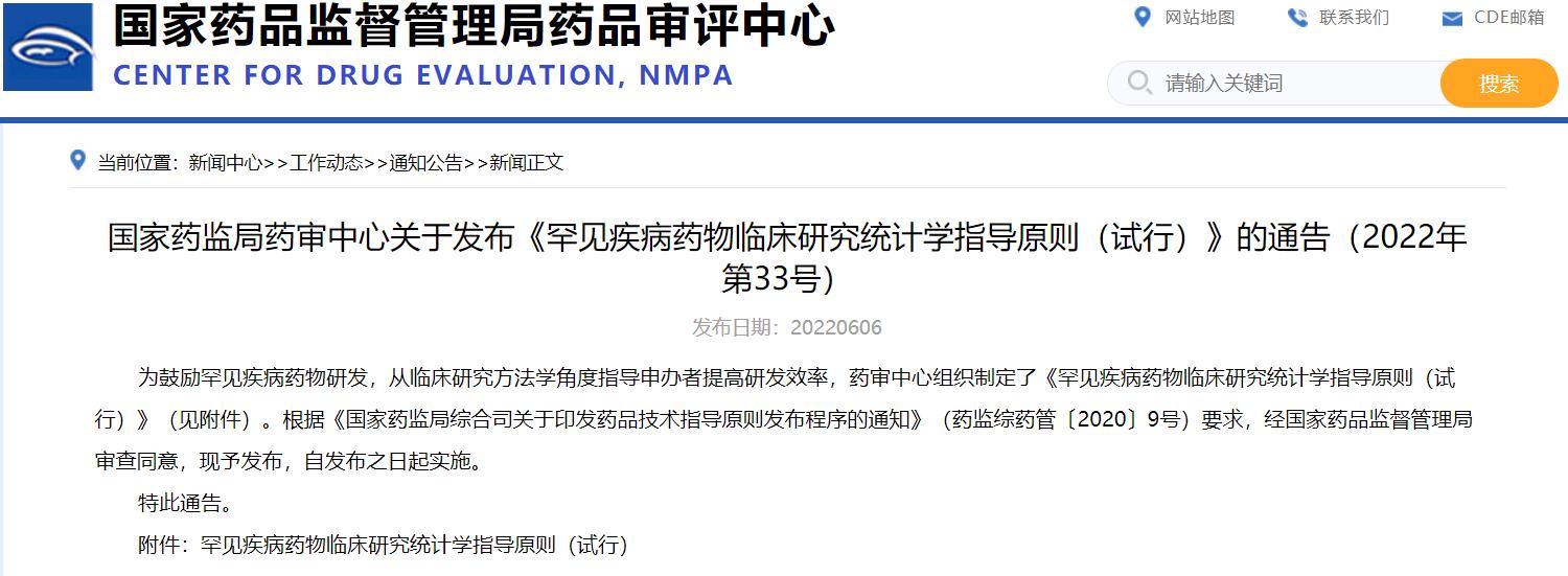 國家藥監(jiān)局藥審中心關(guān)于發(fā)布《罕見疾病藥物臨床研究統(tǒng)計(jì)學(xué)指導(dǎo)原則(試行)》的通告(2022年第33號)
