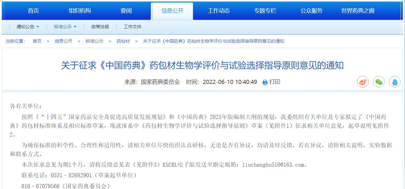 關(guān)于征求《中國藥典》藥包材生物學(xué)評價與試驗(yàn)選擇指導(dǎo)原則意見的通知