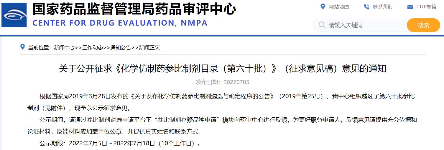 《化學仿制藥參比制劑目錄(第六十批)》(征求意見稿)