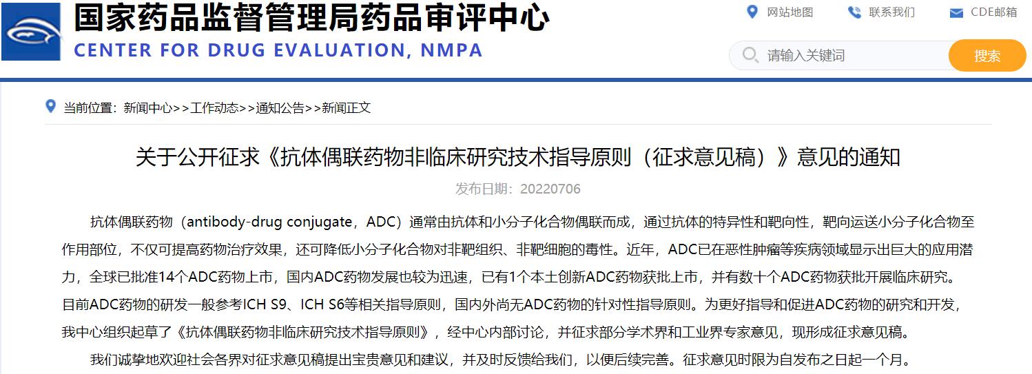 關于公開征求《抗體偶聯藥物非臨床研究技術指導原則(征求意見稿)》意見的通知