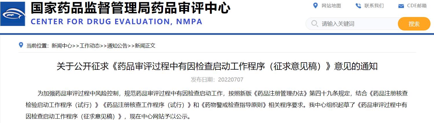 關于公開征求《藥品審評過程中有因檢查啟動工作程序(征求意見稿)》意見的通知