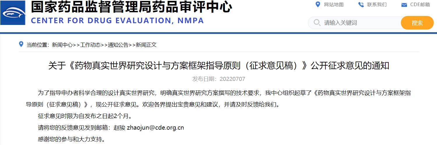 關于《藥物真實世界研究設計與方案框架指導原則(征求意見稿)》公開征求意見的通知