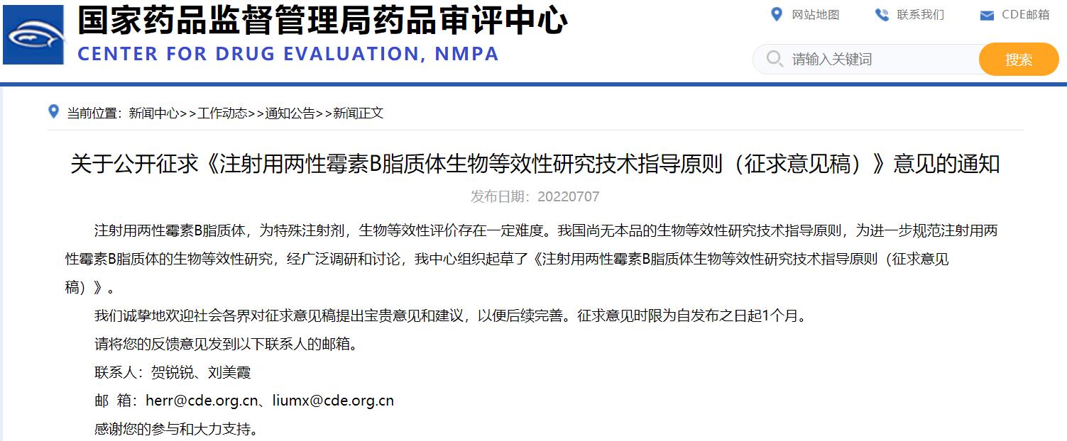關于公開征求《注射用兩性霉素B脂質體生物等效性研究技術指導原則(征求意見稿)》意見的通知
