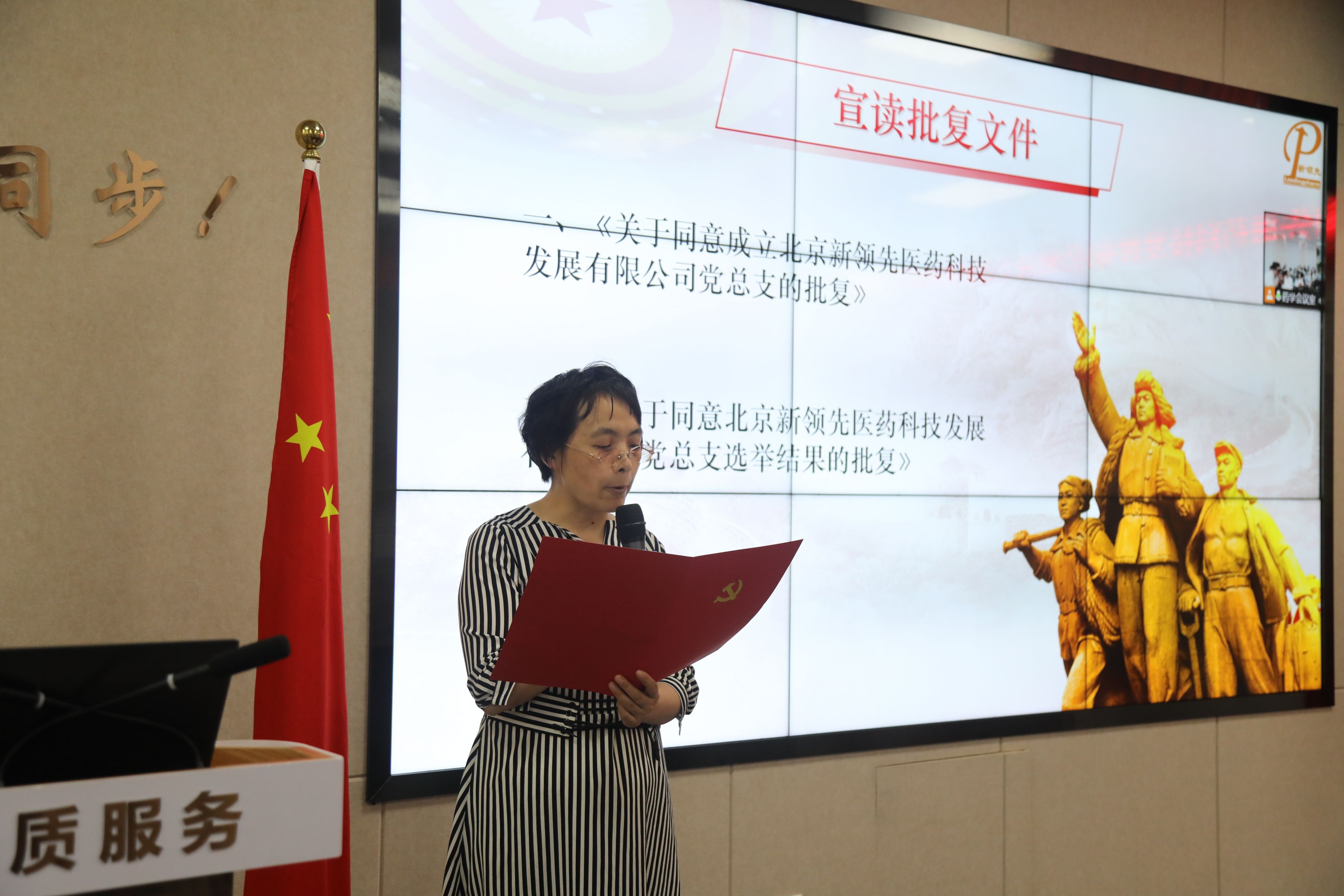 ▲ 黨總支宣傳委員汪六英同志宣讀了中關村科學城黨委《關于同意成立北京新領先醫藥科技發展有限公司黨總支的批復》《關于同意北京新領先醫藥科技發展有限公司黨總支選舉結果的批復》。