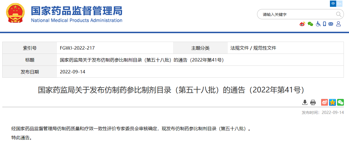 國家藥監局關于發布仿制藥參比制劑目錄(第五十八批)的通告(2022年第41號)