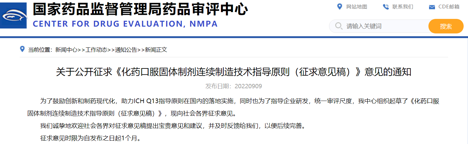 關于公開征求《化藥口服固體制劑連續制造技術指導原則(征求意見稿)》意見的通知