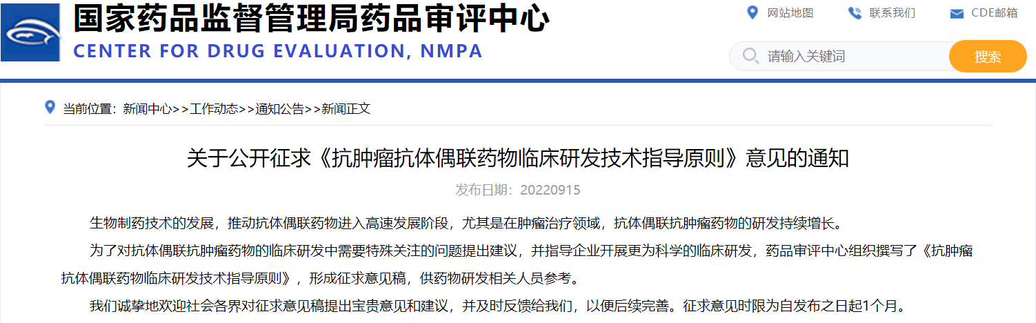 關于公開征求《抗腫瘤抗體偶聯藥物臨床研發技術指導原則》意見的通知
