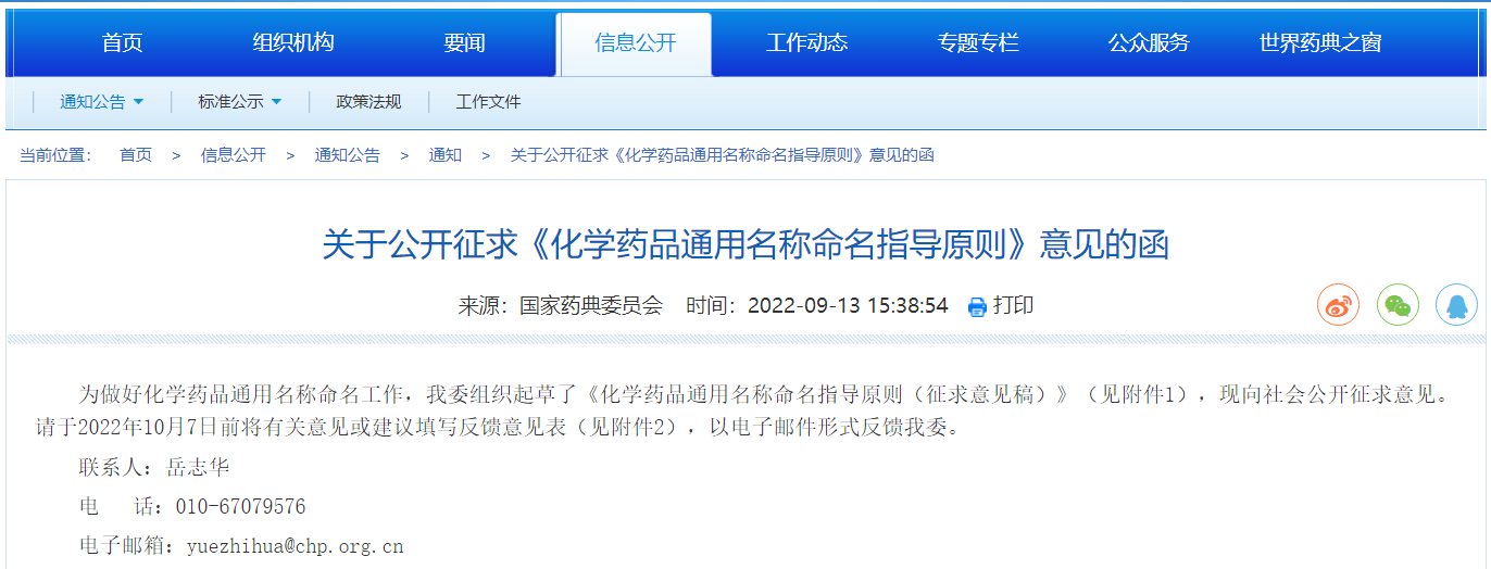 關于公開征求《化學藥品通用名稱命名指導原則》意見的函