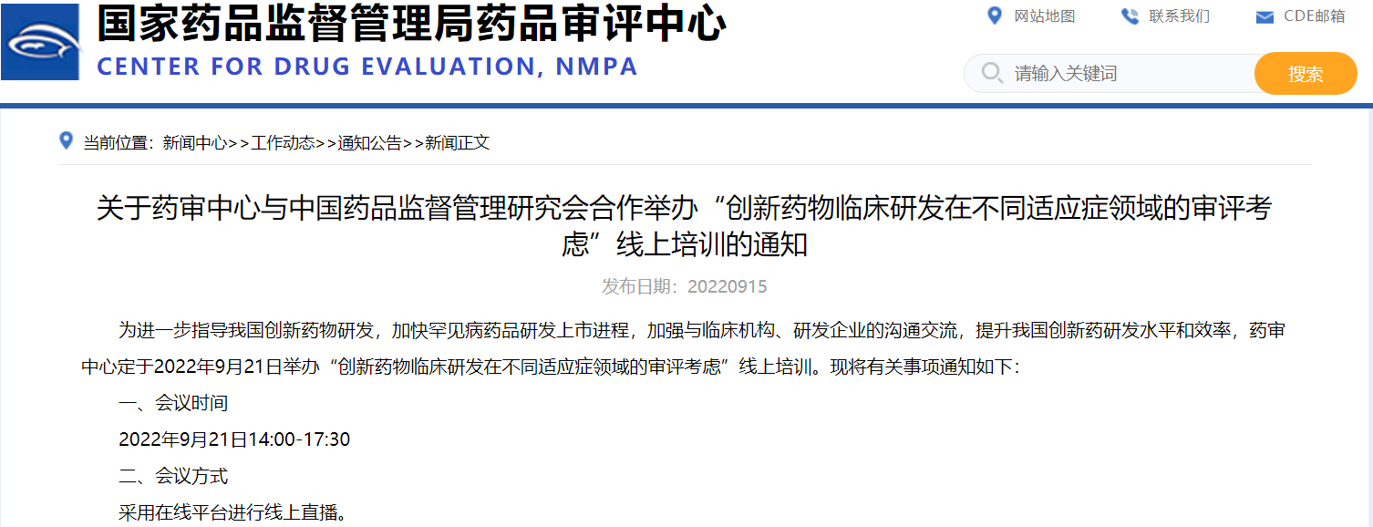 關于藥審中心與中國藥品監督管理研究會合作舉辦“創新藥物臨床研發在不同適應癥領域的審評考慮”線上培訓的通知