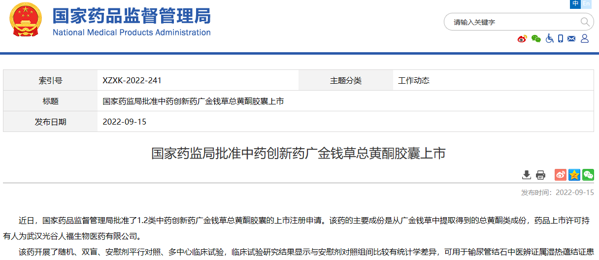 國家藥監局批準中藥創新藥廣金錢草總黃酮膠囊上市