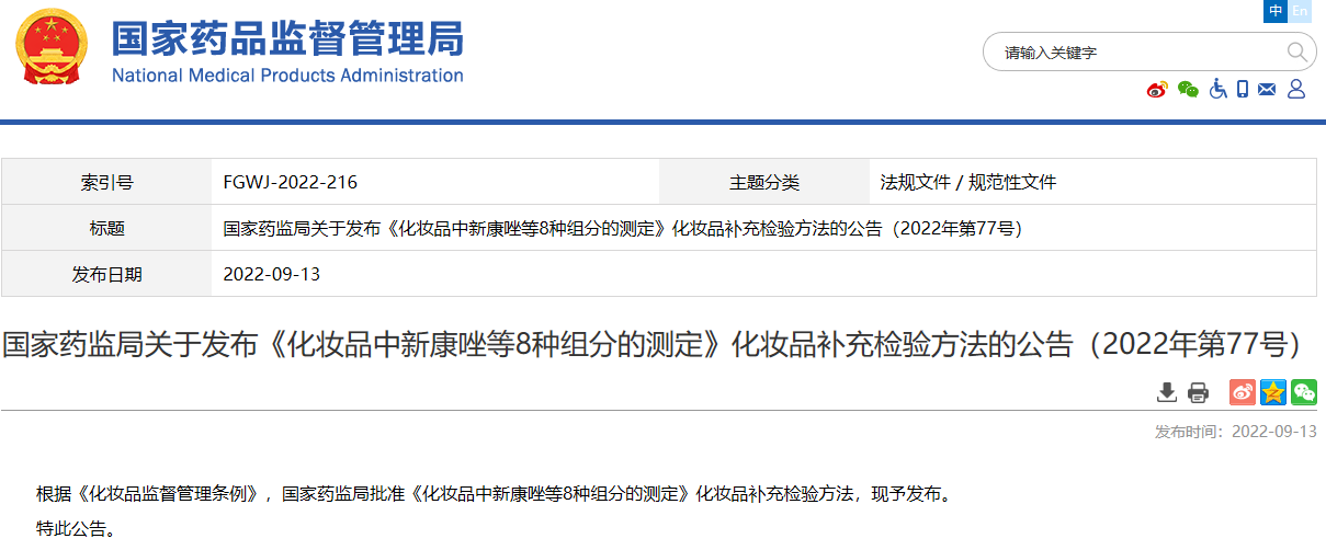 國家藥監局關于發布《化妝品中新康唑等8種組分的測定》化妝品補充檢驗方法的公告(2022年第77號)