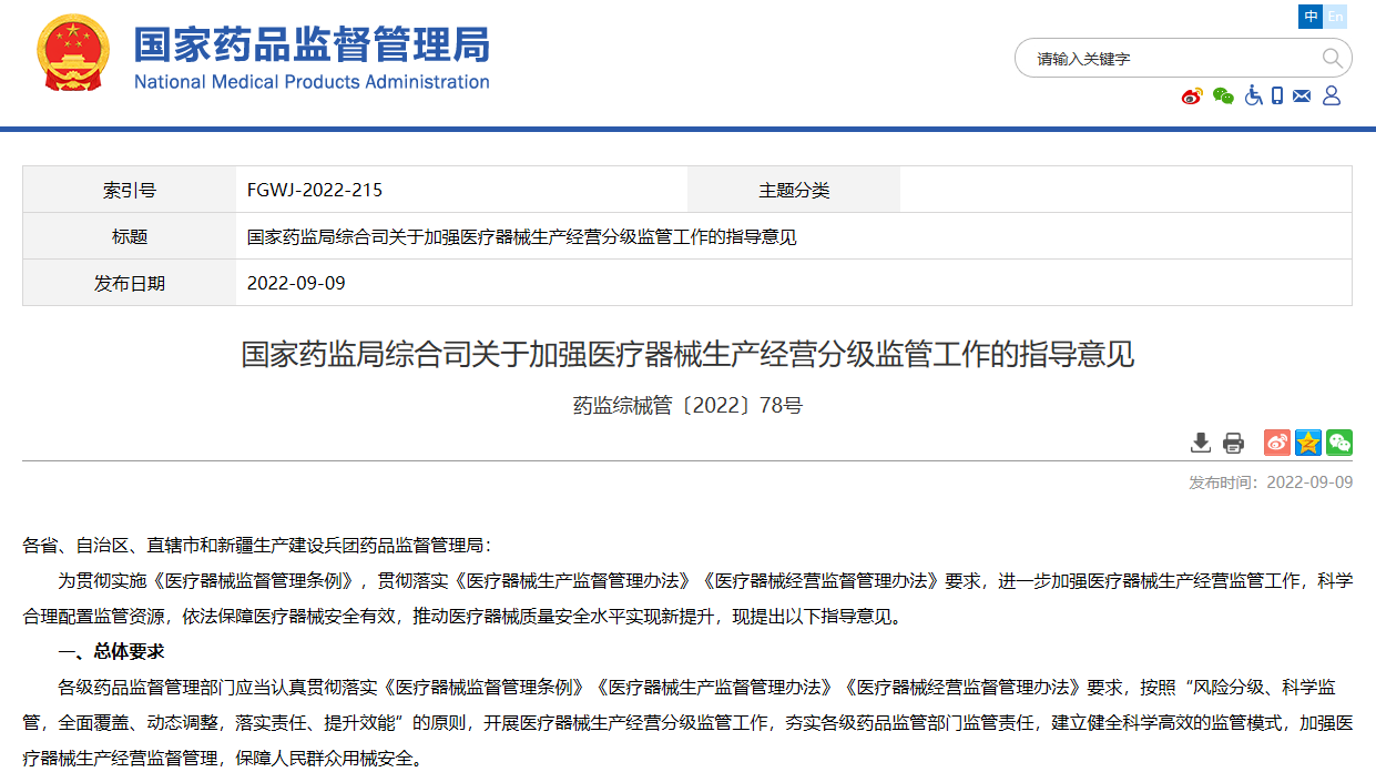 國家藥監局綜合司關于加強醫療器械生產經營分級監管工作的指導意見