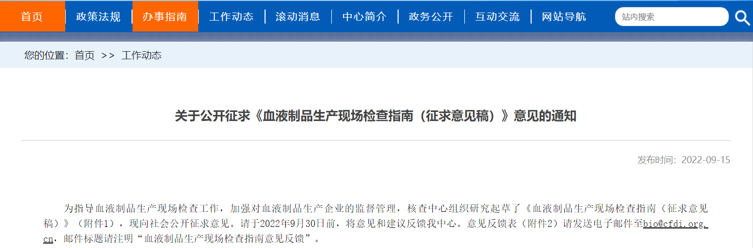 關于公開征求《血液制品生產現場檢查指南(征求意見稿)》意見的通知