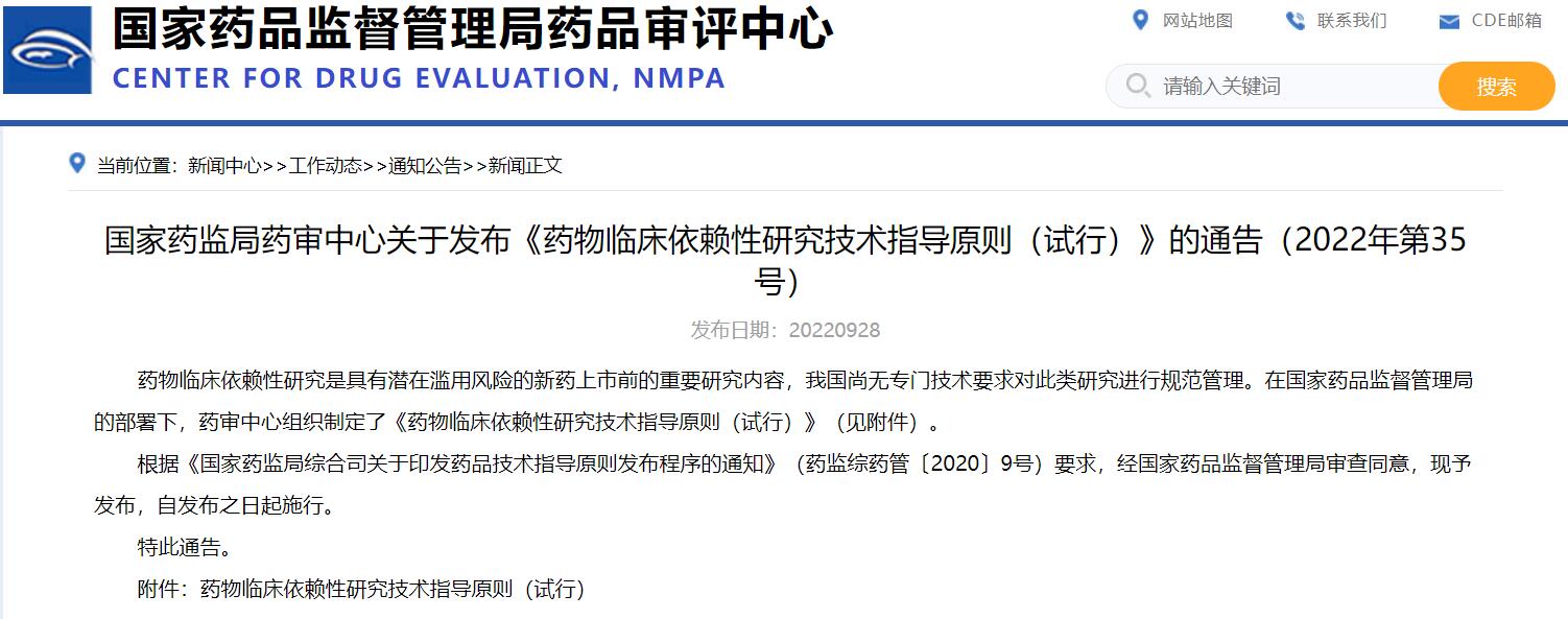 國家藥監局藥審中心關于發布《藥物臨床依賴性研究技術指導原則(試行)》的通告(2022年第35號)