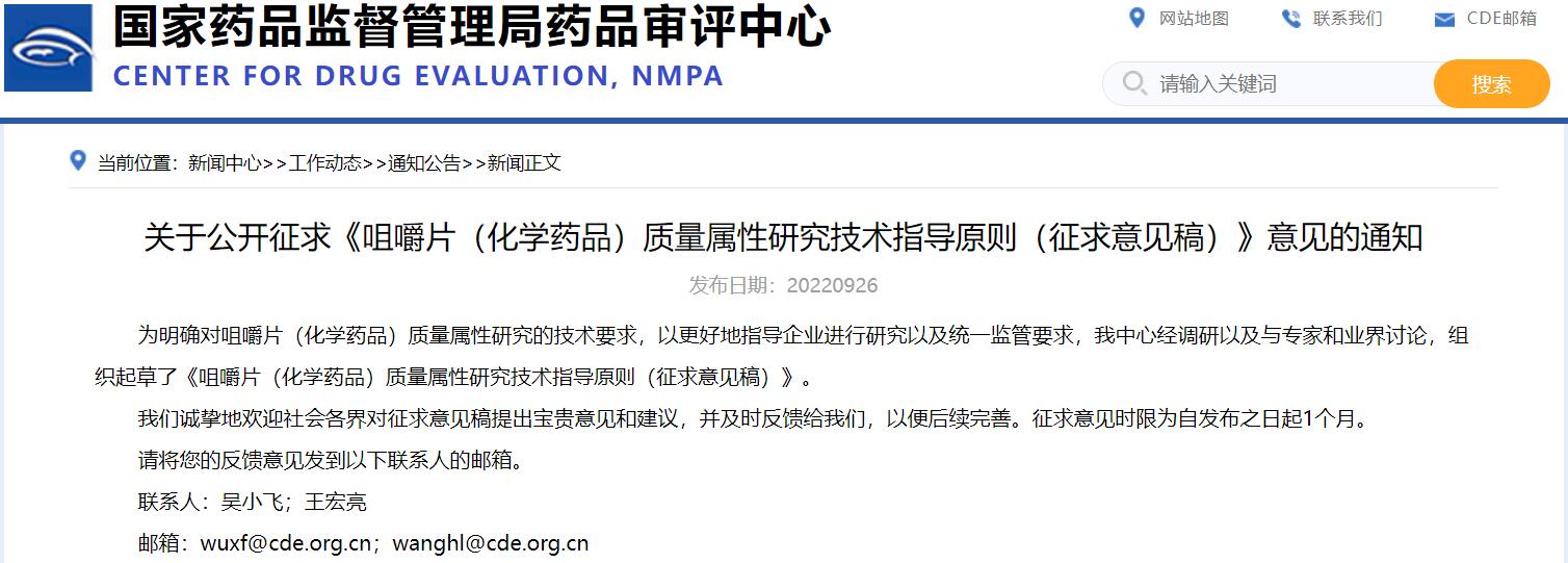 關于公開征求《咀嚼片(化學藥品)質量屬性研究技術指導原則(征求意見稿)》意見的通知