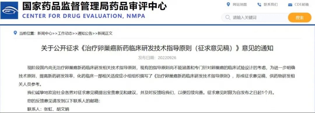關于公開征求《治療卵巢癌新藥臨床研發技術指導原則(征求意見稿)》意見的通知